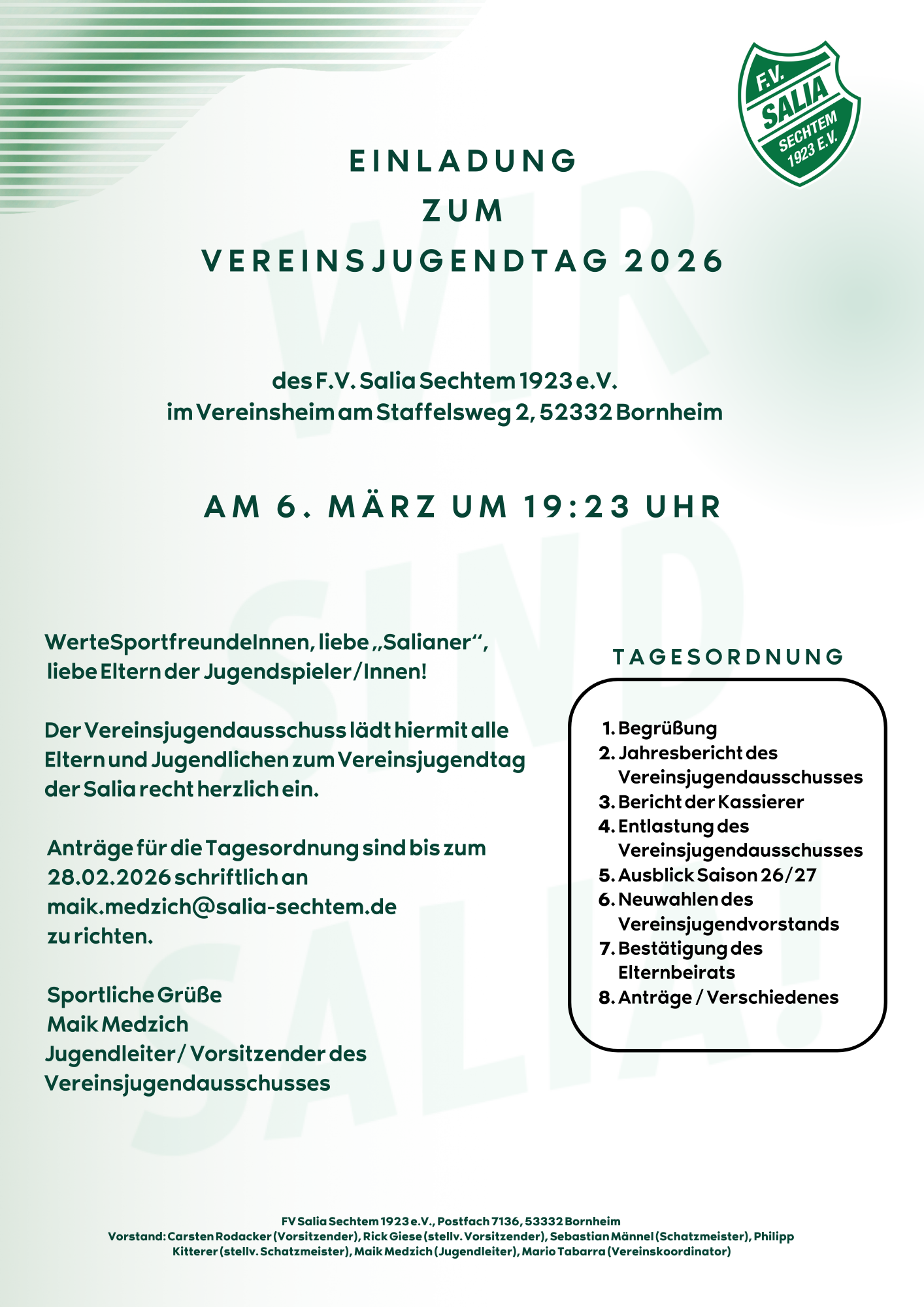 Einladung zum Vereinsjugendtag 2026 Veröffentlicht von Rick Giese am 17. Februar 2026 Auch interessant16. Dezember 2025Wintec Autoglas sponsort TrainingsanzügeMehr erfahren15. Dezember 2025Salia-Mädels zu Gast bei Viktoria KölnMehr erfahren10. September 2025Ordentliche Mitgliederversammlung 2025Mehr erfahren